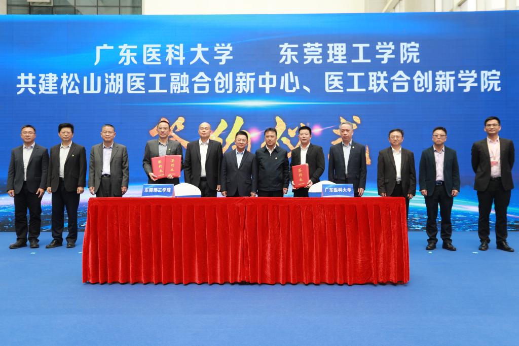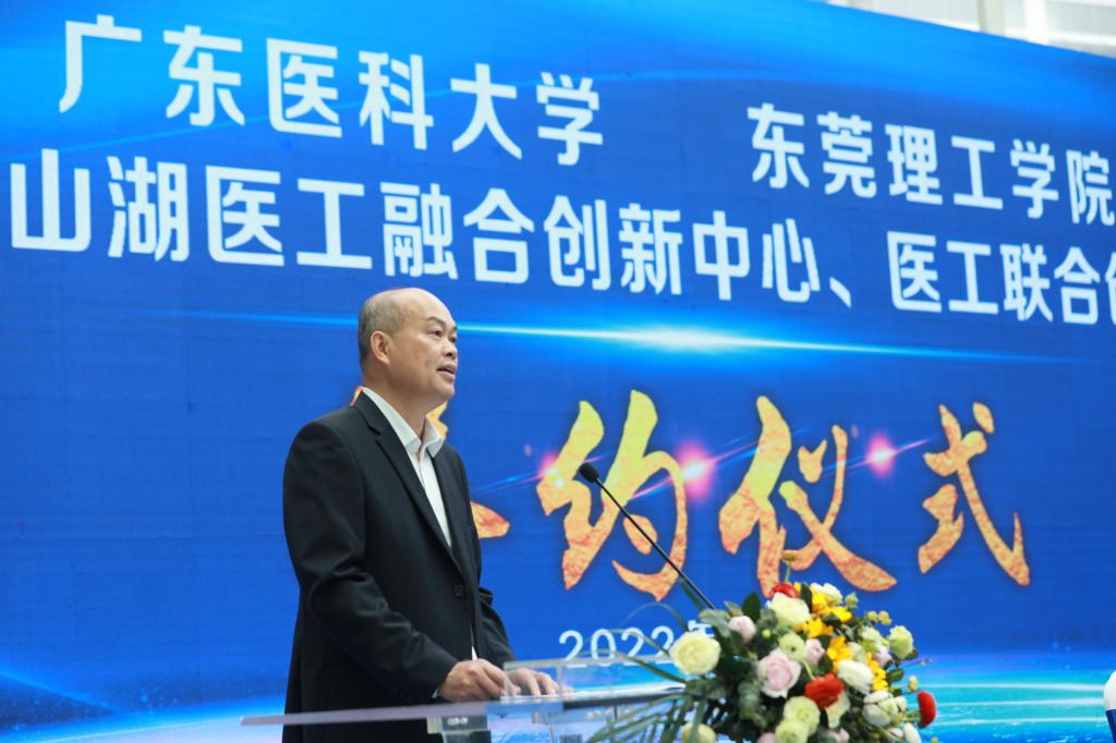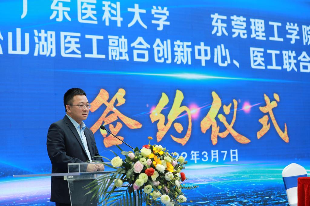 东莞市委副书记、松山湖党工委书记刘炜,广东医科大学党委书记、校长卢景辉,我校党委副书记、校长马宏伟出席并致辞。我校学术委员会主任李琳,校领导杨敏林、李文芳,相关职能部门负责人和二级学院院长、教授,广东医科大学校领导丁元林、刘新光、邝卫红、曾志嵘及相关部门负责人,东莞市科技局、松山湖党工委和松山湖科技教育局等有关负责人参加签约仪式。