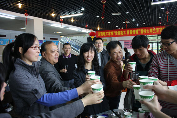 留校过年的学生或是因为准备考研、或是因为参加社会实践,选择远离家人、留校过年。师生们一道举行包饺子比赛、对联征集比赛等,展现了丰富的创意,也赛出了浓浓的年味。学校领导为同学们送上春节慰问品和慰问金,彼此互道祝福、从心欢笑,一期食堂里展现出一派欢乐祥和的景象。正如电子工程学院黄新祥同学说的那样:“虽然我没有在家里过春节,但是这里让我感到家的温暖。”