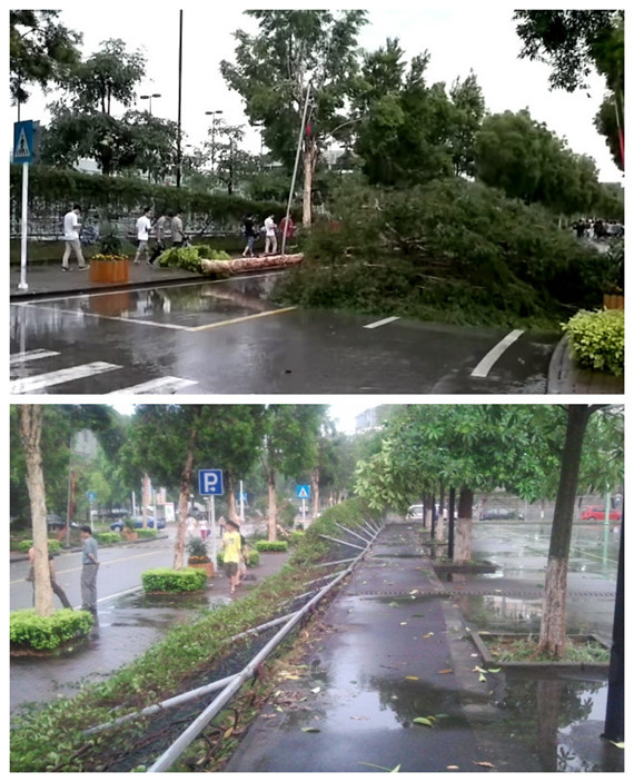 16日暴风雨天对校内公共设施破坏严重,未来几天恶劣天气会继续,请广大师生注意安全,尽量避免在暴风雨天外出