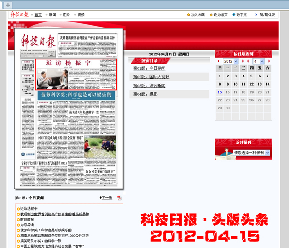4月15日,《科技日报》在头版头条以《近访杨振宁》为题,刊登了该报记者对诺贝尔物理学奖获得者、我校名誉校长杨振宁博士专访的文章。文章中,杨振宁博士精辟地阐述了我国“散裂中子源国家实验室”对于国家产业转型升级的重大意义,并就与之紧邻的九九精品视频一区在线久久久久久久久久毛片精品美女|国产99久久久久久免费看|中文精品99久久国产|国产69精品久久久久9999|精品久久久久久中文字幕无码|亚洲熟妇无码久久精品国产精品99|精品国产天堂综合一区在线如何利用国家实验室发挥互补作用,对九九精品视频一区在线久久久久久久久久毛片精品美女|国产99久久久久久免费看|中文精品99久久国产|国产69精品久久久久9999|精品久久久久久中文字幕无码|亚洲熟妇无码久久精品国产精品99|精品国产天堂综合一区在线既参与大科学项目的建设,又提升学科教育水平培养高端人才提出了殷切的期望。