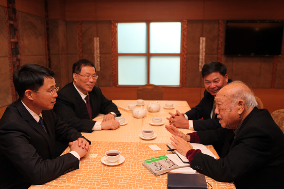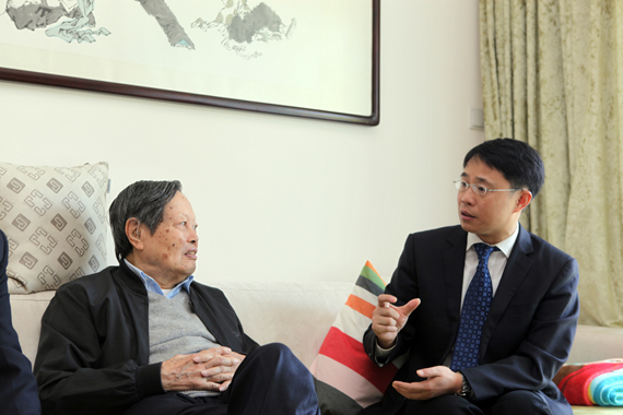 校领导向杨振宁博士汇报了学校近期的发展情况和远期发展规划,并代表全校师生员工送上新春的祝福。杨振宁博士思维敏捷、十分健谈,在得知学校在教学、科研、学科建设等方面都取得了长足的发展时十分欣慰。同时,他对学校今后的发展也提出了许多宝贵的意见,他希望学校再接再厉,取得更大的成绩。