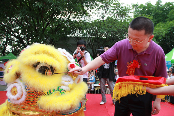 精彩的醒狮表演后,校党委委员、校长助理、莞城校区管委会主任邢大立为雄狮点睛,预祝工模成功举办。