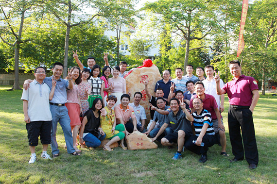 聚会当日,校友们争相在观赏石前合影留念,并摆出同窗时光里各式各样的合影队形及动作,追忆着那些年难忘的青春岁月。一片片承载着无限美好思忆情怀的笑声洋洒在青葱草地上。