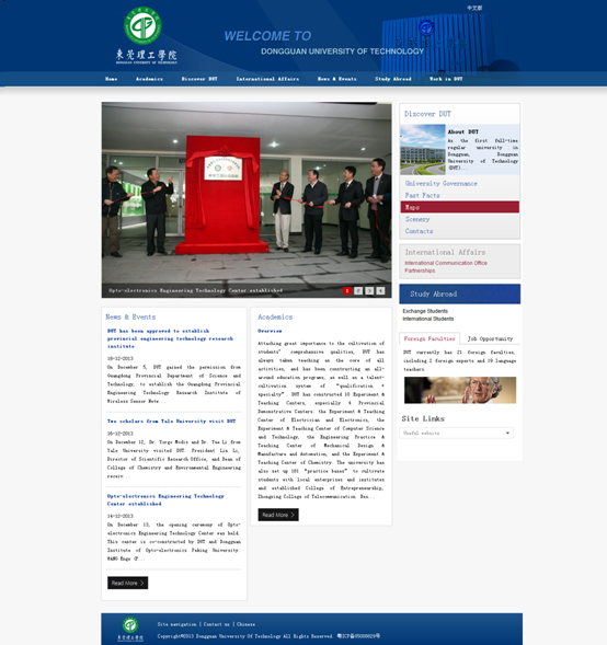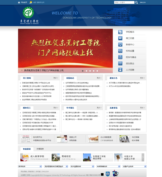 1月1日,经过半年的酝酿,改版后的东莞理工理工学院门户网站正式上线。改版后的网站信息更丰富,浏览更便捷,新增了“通知公告”、 “学术预告”、“高教资讯”、“快速通道”、“友情链接”等版块。为进一步做好校务公开,加强依法治校,网站设立了“信息公开”栏目和“书记校长信箱”。为加强国际交流,扩大学校影响,网站还设立了英文版子站网页。欢迎广大师生对改版后的门户网站提出修改意见。
