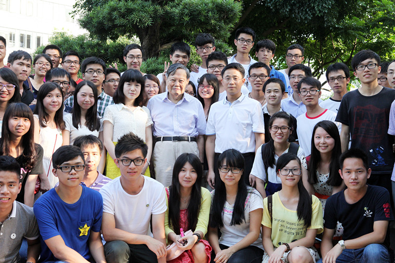 杨振宁博士亲切地与在场青年教师代表和学生代表交流,询问学生的学习情况和学校专业设置情况,并与我校领导、青年教师代表和学生代表在罗汉松前合影留念。