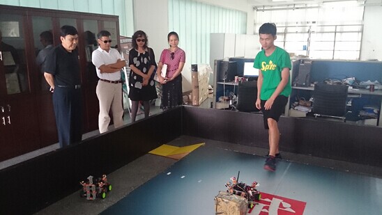 学生向客人展示研制的机器人竞技作品
