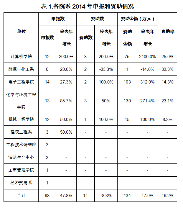 据统计,今年获资助项目主要分布在5个院系,其中,化学与环境工程学院3项,资助额130万;计算机学院3项,资助额75万;能源与化工系2项,资助额111万;电子工程学院2项,资助额103万;机械工程学院1项,资助额15万。较2013年,获资助项目数方面,增长率达100%或以上的有计算机学院和电子工程学院;获资助金额方面,增长率达100%或以上的有计算机学院、电子工程学院、化学与环境工程学院、机械工程学院,均实现较大幅度增长。