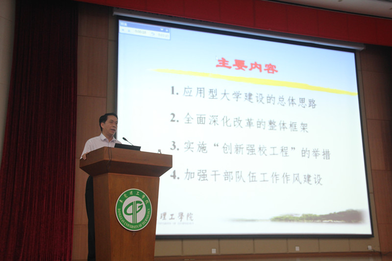 报告中,李琳明确了应用型大学建设的总体思路。他指出,应用型大学建设是全面贯彻落实十八届三中全会精神,实现学校第二次党代会提出的目标的战略决策。他从我国高等教育人才培养模式“接地气”不足的现状,强调应用型大学建设要整合政府、科研院所、企事业单位、学校等多方资源,全面融入产业,着力构建应用型人才的培养体系;要面向产业、行业转型升级问题及需求,建设应用型人才培养协同中心;要基于东莞产业发展布局调整学科专业;要加大企事业单位共建学校的力度,建设学校董事会、二级教学机构理事会、专业建设委员会;要联合企事业单位进一步完善应用型人才培养方案;要建设“双结构型”师资队伍;要借力企事业单位共建人才培养基地,直接服务东莞产业;要构建服务地方经济社会的研究课题库。