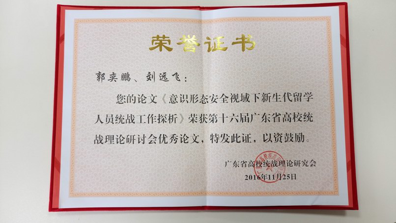 11月24日至25日第十六届广东省高校统战理论研讨会在广东轻工职业技术学院南海校区举行。我校郭奕鹏、刘远飞老师撰写的《意识形态安全视域下新生代留学人员统战工作探析》荣获优秀论文奖。