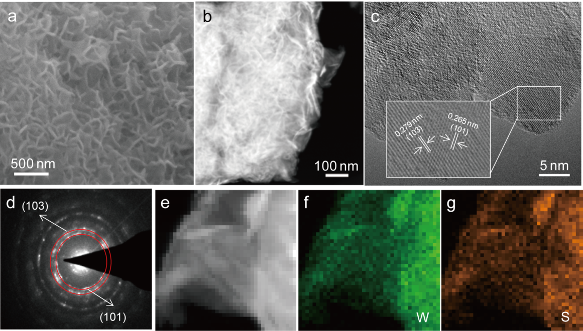 该研究通过提高二硫化钨结晶度以达到提高其稳定性的效果(在循环测试10000次后容量保持82%),并且首次使用二硫化钨电极作为一个负极与MnO2@TiN(正极)成功的组成了非对称超级电容器。体积能量密度能达到0.97 mW h cm-3。这项工作提供了使用WS2纳米结构和其他2D TMDS在构建高性能储能设备的新机遇。