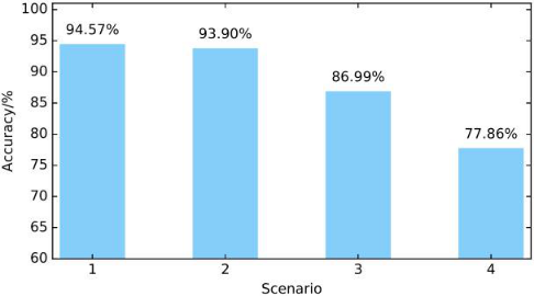 不同工况下单损伤定位准确率:1为卷积神经网络算法,2、3、4为其他方法
