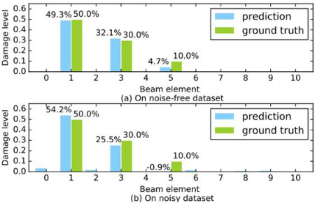 文章同时考虑了多损伤的识别与定位于噪声影响下的检测情况,结果显示依然有着良好的预测结果(图3)。