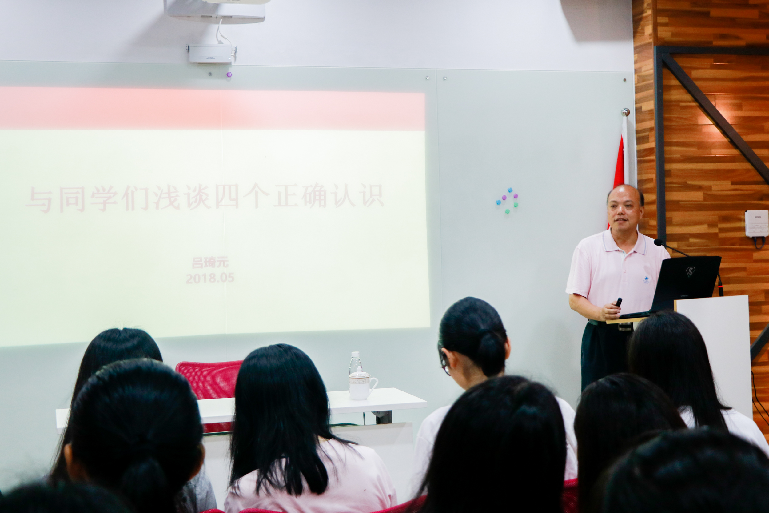 吕琦元就“正确认识世界和中国发展大势、正确认识中国特色和国际比较、正确认识时代责任和历史使命、正确认识远大抱负和脚踏实地”四个方面引用古今中外的实例作为论述,指出其中丰富的思想内涵,以此加深同学们对马克思主义信仰的感悟,引发他们对马克思主义的深入思考;此外,他还带领同学们学习了习近平在“纪念马克思诞辰200周年”大会上的讲话以及“五四”寄语与十九大报告这两个方面的重要阐述;他与同学们一同回顾马克思的卓著贡献,以马克思的人生经历激励同学们做个志存高远的人。