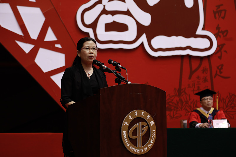 李琳在讲话中寄语毕业生要“知行合一,务实发展”。他表示,“知行合一、立德树人”是学校人才培养的核心理念。“四年来,同学们共同领略了以院士、“长江学者”、“杰青”等为代表的大师学者的大家风范;书写了在创新创业教育实践中的青春风采;体验了“空调大学”夏日的清凉舒爽;共享了建校25周年的欢欣喜悦;续传“挑战杯”等各类全国性大赛喜讯佳音。同学们既是学校高水平理工科大学建设的参与者、推动者,更是受益者。他指出,“知行合一”既是新时期广东精神的重要体现,也是莞工校园文化的重要内涵。“知行合一、立德树人”是学校人才培养的核心理念。对于同学们来说,做知行合一的实干家是大家走出校园、迈入社会、经营人生应该坚守的方向。他希望毕业生们能珍惜这个伟大的时代,积极践行“学而知不足”的莞工精神,争做新时代的弄潮儿、奋斗者和实干家。最后,李琳以一首藏头诗祝福毕业生“此去有繁华似锦,待归来依然如故”: