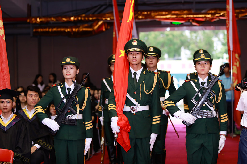 首次亮相毕业典礼的国旗护卫队踏着整齐有序的步伐进入会场,庄严的升国旗仪式拉开了本次毕业典礼的序幕。