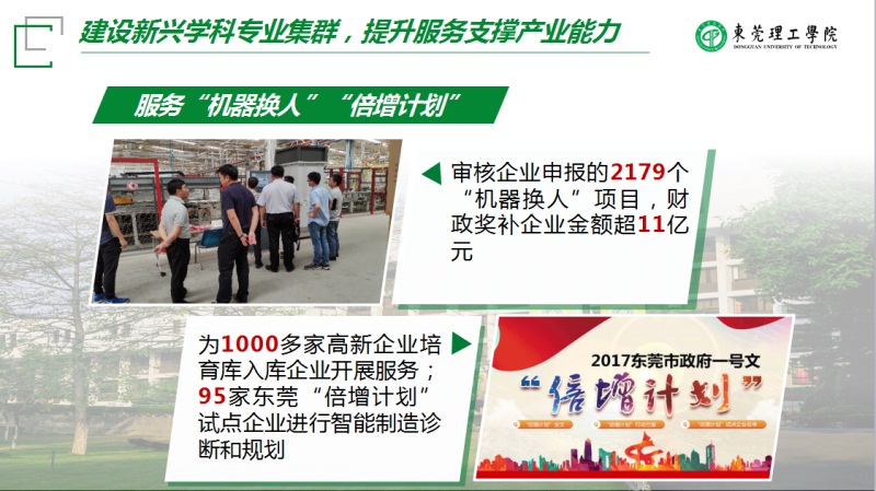 二是建设新兴学科专业集群,提升服务支撑产业能力。学校围绕智能制造产业链优化专业结构,加强内涵建设,新增机器人、网络安全、智能控制等专业14个,改造传统工科专业9个,促进了学科交叉融合,提升了服务支撑产业能力,为培养实干型人才打下坚实基础。在东莞市推进企业“机器换人”、实施重点企业规模效益“倍增计划”中,我校教师团队为政府部门和2200多家企业提供了专业化服务。学校与东莞市横沥镇共建“模具产业协同创新中心”“先进机械(模具)制造应用型人才协同培养基地”,共建实验室15个,400多名学生在基地实习、就业、创业,孵化一批创新型企业。横沥镇的协同创新项目获得2016年广东省科学技术奖特等奖。