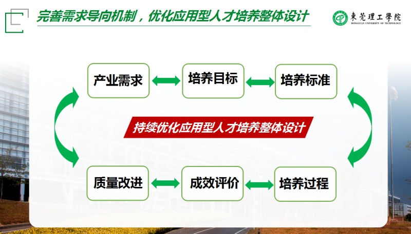 成洪波从三个方面介绍了具体做法。一是完善需求导向机制,优化应用型人才培养整体设计。学校确立“知行合一、立德树人”的核心理念,凝练“以卓越的创新教育与实践造福社会”的价值追求,把“勇于担当”“善于学习”“敢于超越”作为人才培养目标的关键词,紧扣“解决产业实际问题能力”“创新精神和创业意识”等细化培养标准,编制教学质量指数,持续优化实干型人才培养“需求-目标-标准-过程-评价-改进”的整体设计。学校与松山湖国家高新区、部分全国百强镇及龙头骨干企业紧密合作,派出40多支师生小分队开展科技产业创新服务,发挥二级学院理事会和专业建设委员会作用,动态跟踪产业前沿信息,掌握一线人才需求。