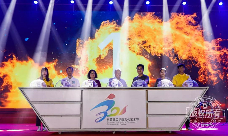 19日晚,吕琦元,宣传部、学工部、教务处、科研处、财务处、武装部负责人以及两名学生代表共同按下光球,启动了以“灯塔领航青春梦,莞工奋进新征程”为主题的2018年文化艺术节。