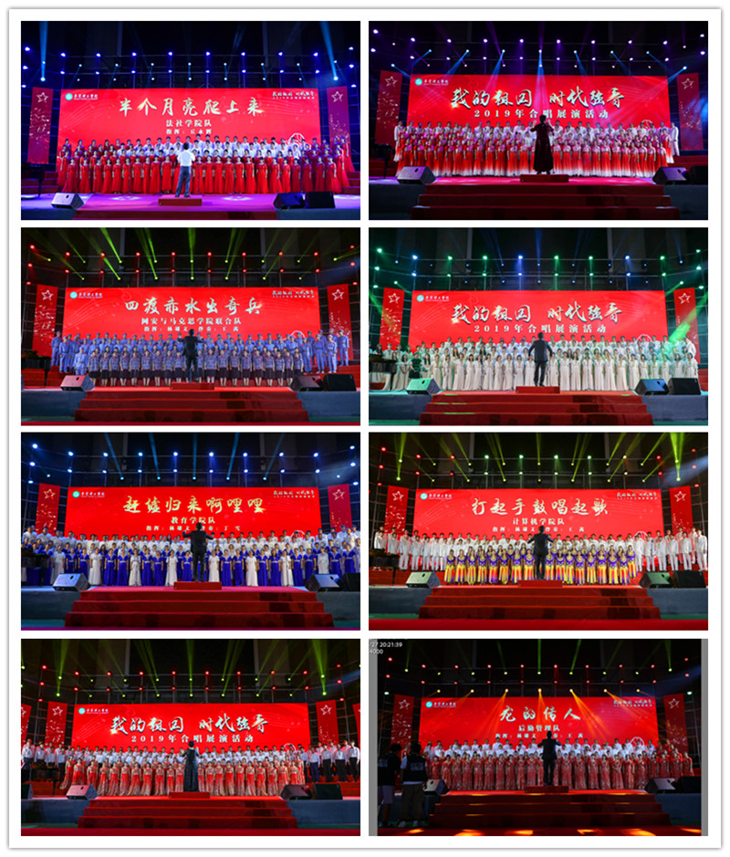 庄重的表彰仪式结束后,“我的祖国时代强音”教职工合唱展演决赛紧随其后展开。进入决赛的8支队伍逐一登台演唱红色经典歌曲,演出曲目有耳熟能详的《龙的传人》,有充满革命热情的《八月桂花遍地开》等,嘹亮歌声萦绕着五彩光束,飘荡在场内上空。学校还邀请了东莞市老干部“青松合唱团”为活动助兴。