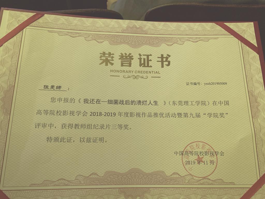 本次论坛期间,中国高等院校影视学会颁发了第十二届“学会奖”、第九届“学院奖”和第四届“学人奖”。传媒系师生作品喜获两项“学院奖”,其中洪晓鑫的纪录短片《越战遗殇》获得学生纪录片组一等奖,以指导老师张曼缔名义报送的学生毕业作品《我还在——细菌战后的溃烂人生》获得教师纪录片组三等奖。这是传媒系首次参加中国高校影视学会影视作品推优活动,成绩喜人。以上获奖作品既有课程作品又有毕业作品,获得学术界评委的肯定是对文传学院传媒系专业建设成果的认可。