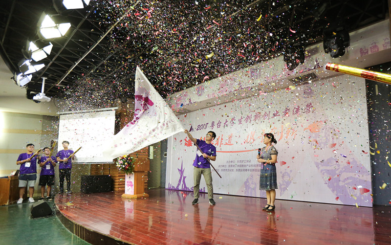 开营仪式上,谢春指出,粤台大学生夏令营是两岸青年交流互动的重要平台,希望同学们利用此次机会互相交流学习,体会两岸同胞同根同源的手足之情,进一步增强创新创业的意识。杨敏林介绍了此次夏令营活动的内容,预祝本次活动取得圆满成功,并为交流营授旗。夏令营营长、我校学生代表陈金晖回顾了上一届夏令营活动的成果;来自台湾佛光大学的杨琬渝同学则表达了对活动的期待,并希望能够将在活动中所学知识带回台湾分享给其他同学。在一片掌声中,阳志萍宣布2018年粤台大学生创新创业交流营正式开营。
