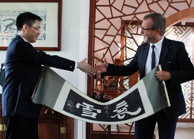 9月5日上午,我校党委书记成洪波、校长李琳在翰墨堂会见了法国国立工艺学院校长Olivier Faron、教学委员会主席Michel Terré和校办公室主任Guillaume Baudet一行。副校长杨敏林、国交处处长胡钦华、文传学院院长田根胜和中法联合学院相关负责人参与了会见。
