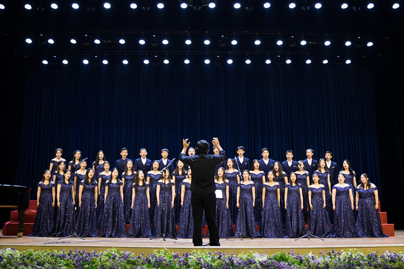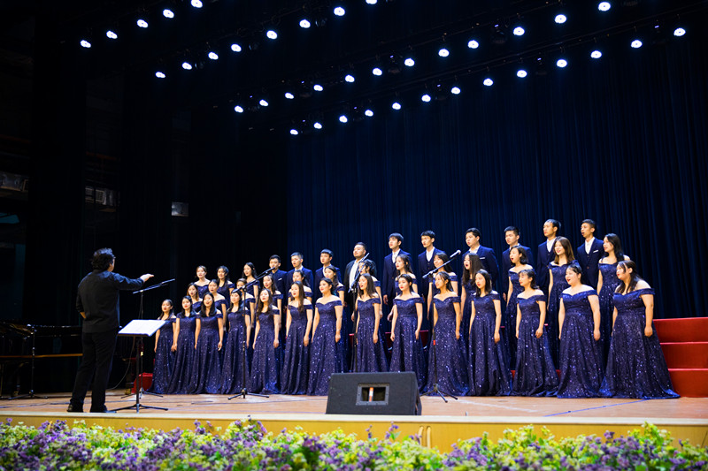 广外学生合唱团演唱的曲目风格多样,以多语言的表现形式,将来自五湖四海的文化呈现在大礼堂的舞台上。广外学生合唱团以无音乐伴奏合唱《半个月亮爬上来》《卖花生》作为开场节目,黛蓝的礼服,星光闪烁,纯净透亮的和声,悠扬醇厚。菲律宾民谣《卖花生》愉快的音律在空气中缓缓流动,客家话歌曲《花树下》别具特色的软糯音色,相互应和,菲律宾劳动者的愉悦与客家的远乡情跃然眼前。无论是极具民族特色的民族乐曲或是温柔低声呢喃的抒情乐曲,广外学生合唱团都以其独特的极具感染力的方式完美地呈现给在场观众,让他们更近距离感受到艺术的魅力。