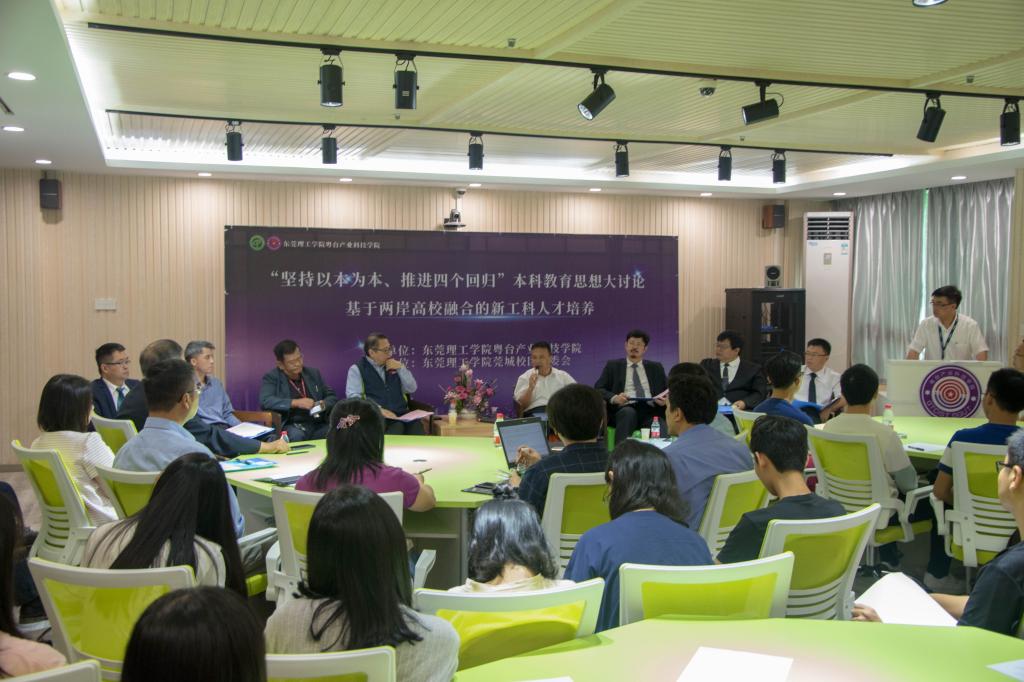 为全面贯彻落实习近平总书记在2018年全国教育大会上重要讲话精神,陈宝生部长在新时代全国高等学校本科教育工作会议提出的“坚持以本为本,推进四个回归”,加快建设高水平本科教育、全面提高人才培养能力的要求,在学校的统一部署下,10月15日,粤台产业科技学院开展“坚持以本为本、推进四个回归”本科教育思想大讨论——基于两岸高校融合的新工科人才培养。我校副校长马宏伟教授、台北科技大学管理学院院长邱垂昱教授、迅得机械(东莞)有限公司总经理罗锦堃,学校有关职能部门负责人,粤台学院各系主任、教师和学生代表参加了讨论。