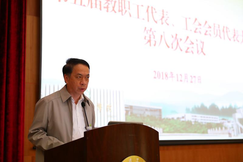 受党委书记成洪波委托,党委副书记吕琦元代表学校党委作总结讲话。他指出,这次会议的一项重要任务,就是表决通过学校教师专业技术职务评审与聘用等有关文件。相关文件在去年同期的七次会议上已原则通过,并成功试行一年。在文件实施的过程中,学校坚持边行边试,逐步完善。因而在去年方案的基础上,人资处以及相关职能部门做了大量的调研工作,广泛征集意见。本次会议通过的方案,就是在广泛听取教职工意见后修改完善的成果。