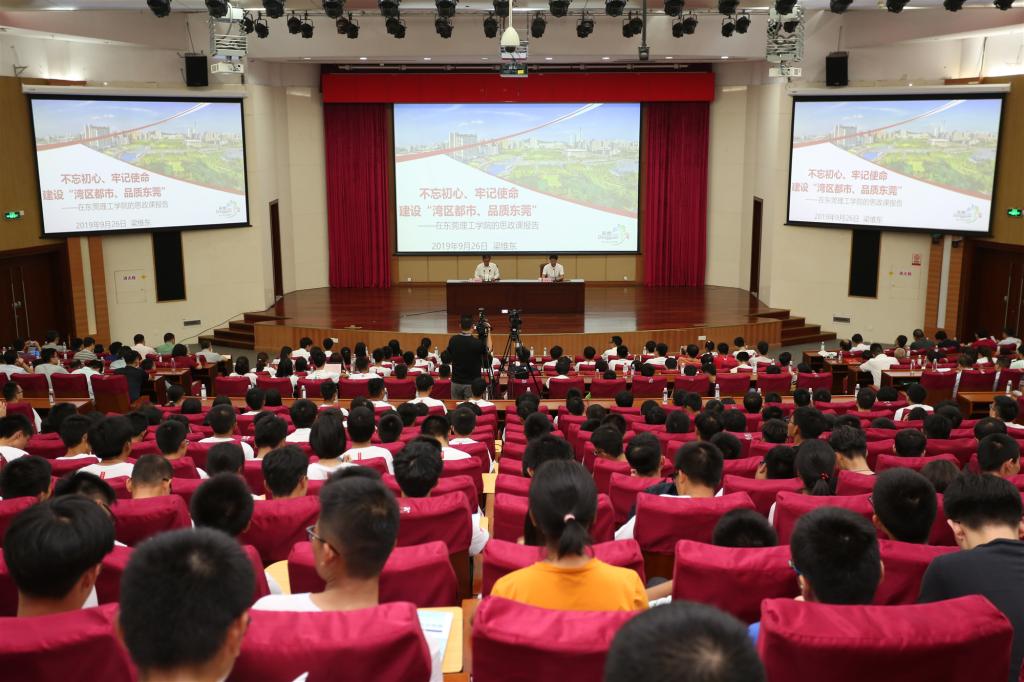 随后,梁维东书记以《不忘初心、牢记使命建设“湾区都市、品质东莞”》为题,用翔实的数据、生动的事例和自己的经历,与近500名师生交流学习贯彻习近平新时代中国特色社会主义思想的心得体会,分享新中国成立70年特别是改革开放40年来东莞改革开放的发展实践和经验体会。梁维东指出,东莞40多年来取得巨大成就的经验在于,坚定不移加强党的领导和党的建设,坚定不移用马克思主义创新成果指导实践,充分利用区位优势坚定不移用好改革开放关键一招,坚定不移办好自己的事,坚定不移践行以人民为中心的发展思想。