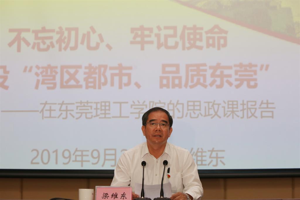 9月26日上午,东莞市委书记、市人大常委会主任梁维东来到我校,调研特色育人平台,为师生讲授思政课,推动“不忘初心、牢记使命”主题教育深入开展。梁维东勉励我校师生要坚定理想信念,练就过硬本领,扎根东莞、服务东莞,在新时代东莞改革开放中施展才华、建功立业。