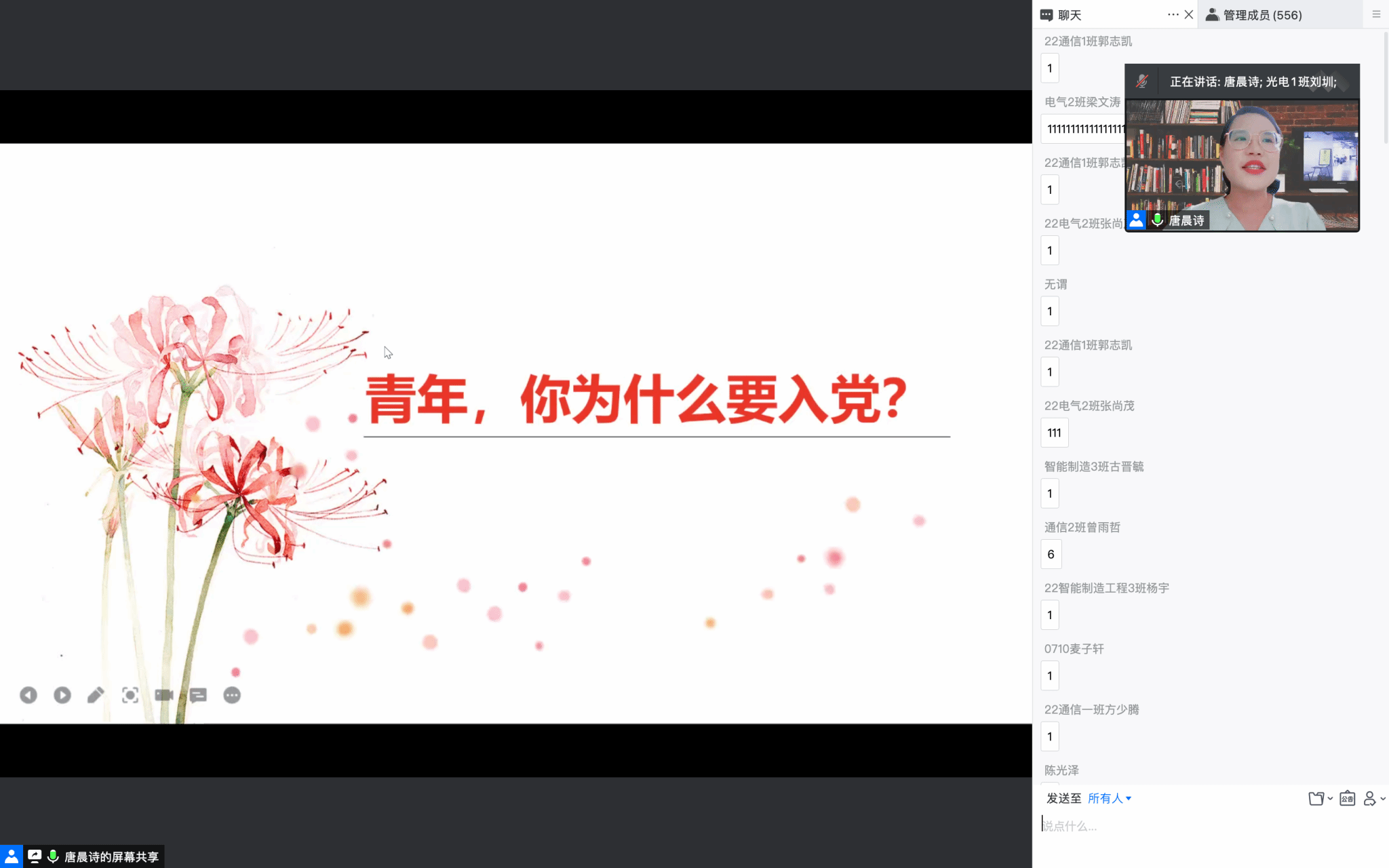 电子工程与智能化学院特聘班主任、马克思主义学院教师唐晨诗博士组织了一次特别的主题班会,她以《青年,你为什么要入党?》为题,向电子工程与智能化学院2022级新生详细讲解青春向党的意义,引导同学们增强对中国共产党的了解与认识,积极向党组织靠拢,争取成为新时代有为青年。