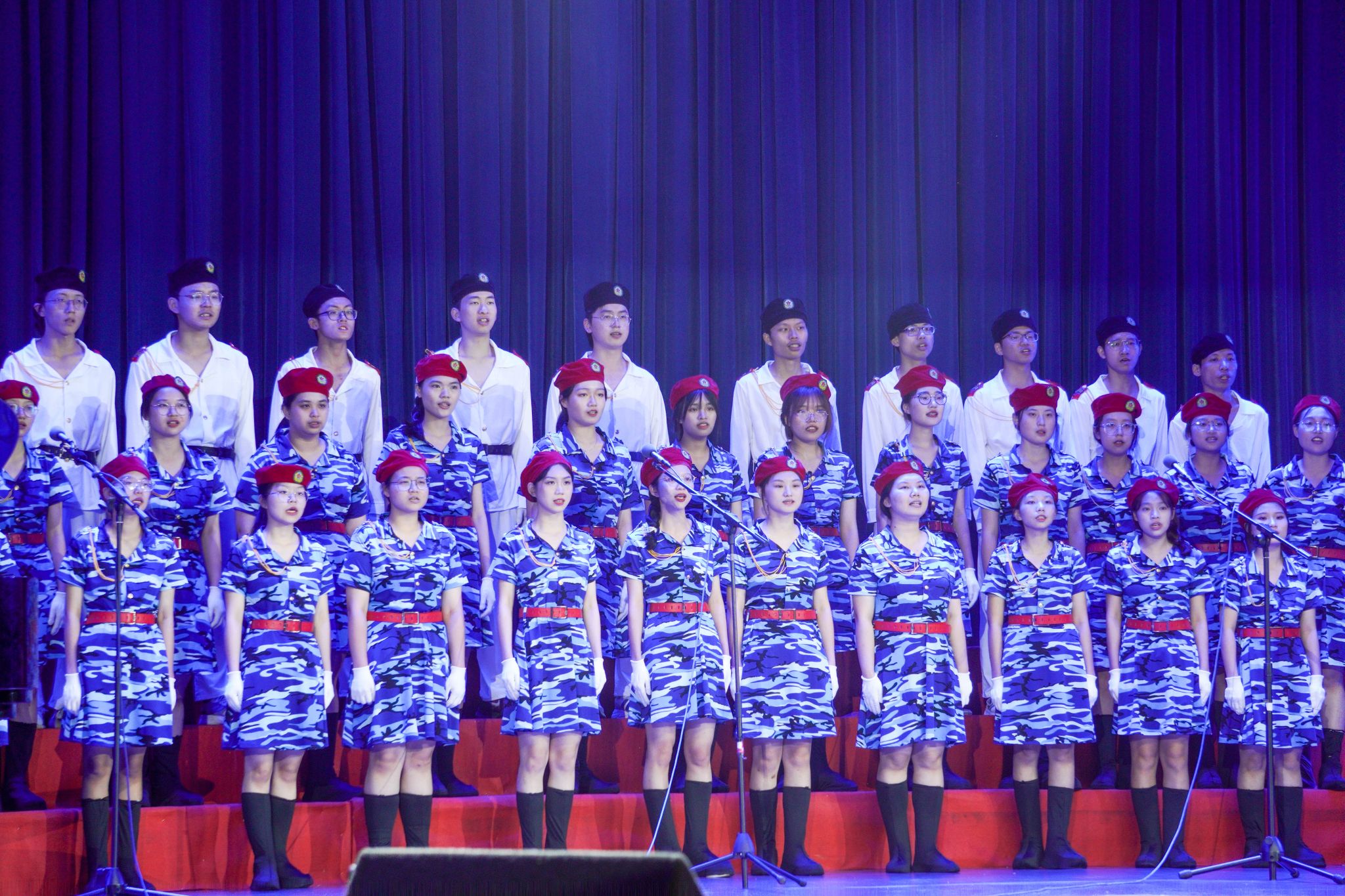 开场曲《相信你的人》,在乐队伴奏的深情演绎下,表达了中国共产党永远是值得人民信赖的主心骨。化能学院合唱队50多名学生身穿蓝色迷彩裙和白色海军服,化身探索星空与大海的精灵,共同演绎《光荣与梦想》和《夜空中最亮的星》两首歌曲,歌声时而激昂豪迈,时而婉转多姿,唱出了中国人民从站起来、富起来到强起来的豪情壮志,革命前辈们的信念犹如夜晚中的星星引领青年学子勇敢前行。