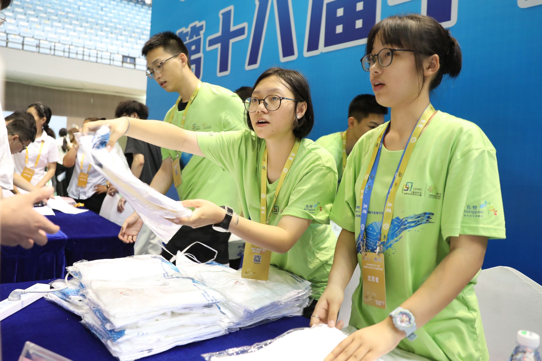 8月10日早上9点,我校松山湖校区体育馆迎来了参加第十八届研究生电子设计竞赛全国总决赛的师生们。体育馆内赛事氛围热烈,蓝色背景板前,身穿绿色志愿服的志愿者们坐成一列,面带微笑地递上特别为研电赛设计的专用活动包,欢迎来自全国各地的老师和同学们。