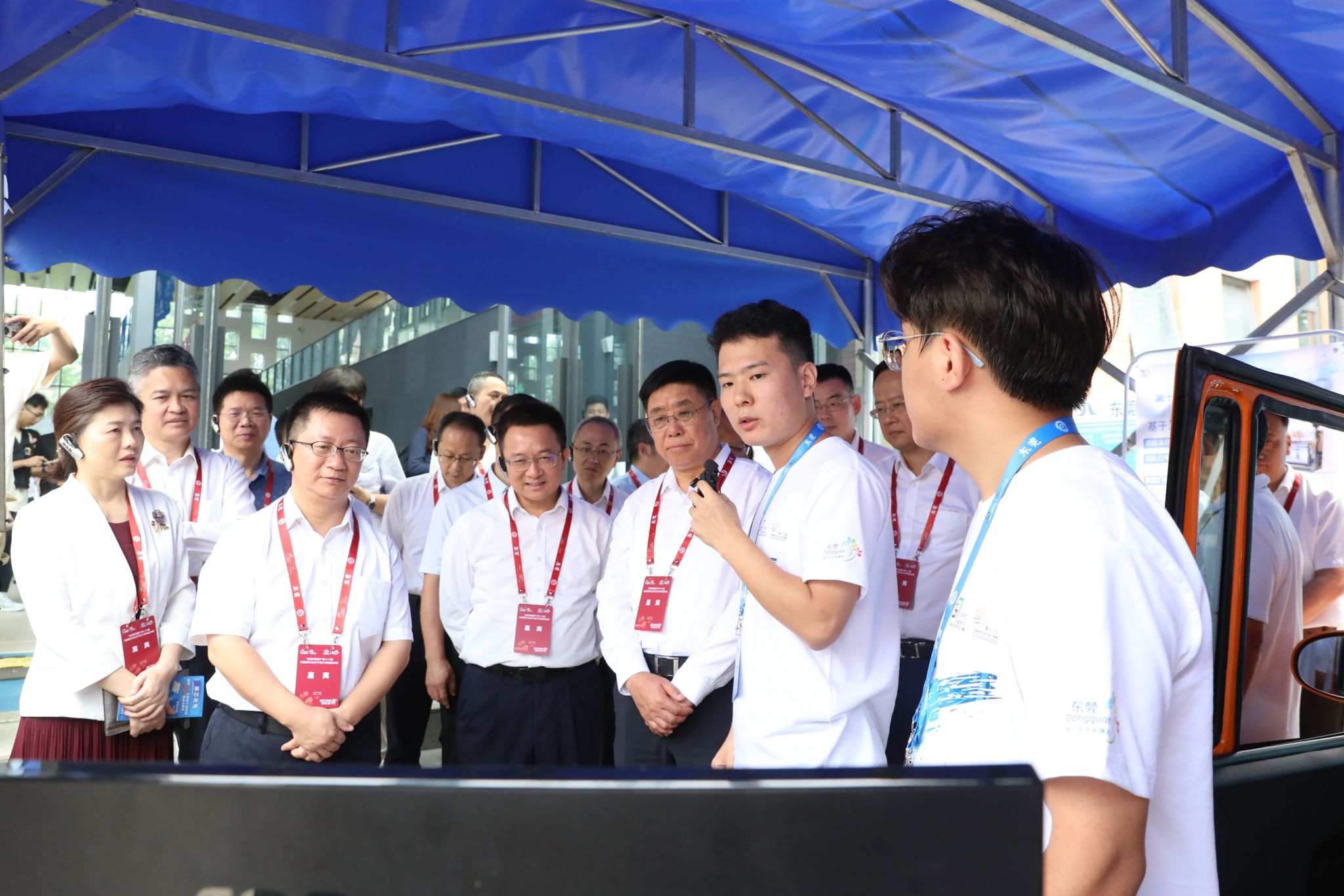 开幕式后,参会领导嘉宾前往东莞中学松山湖学校体育馆巡视作品。我校“驾享无忧”队作品《基于深度学习的疲劳驾驶检测系统》获得关注。团队成员向参观人员介绍了作品内容、系统功能以及实物部署场景。
