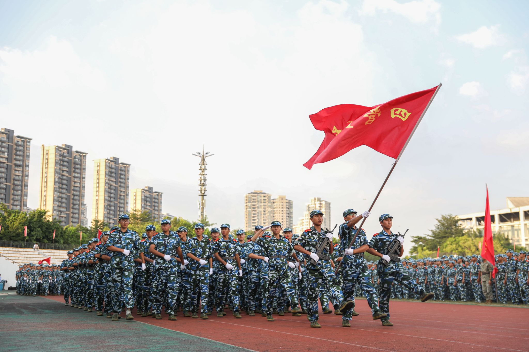 27日下午,两校区田径运动场气氛热烈,红色营旗在风中飞扬,整齐划一的迷彩队伍尽显风采。校党委书记、军训工作领导小组组长成洪波,校党委副书记、军训旅政委李忠红,校党委委员、副校长、军训旅旅长杨敏林,校党委委员、副校长李文芳,各二级学院党委书记,军训旅有关负责同志,各营教导员,连指导员参加本次大会,检阅全体新生的军训成果。
