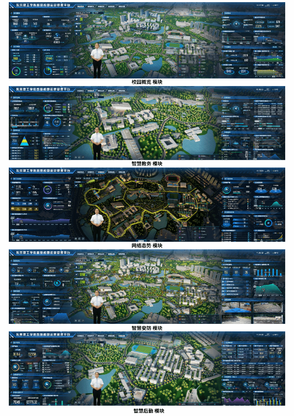 该平台由校园概览、智慧教务、网络态势、智慧安防、智慧后勤五大核心模块组成,结合AI数字人技术,每个模块都紧密围绕校园管理的实际需求,提供了丰富而实用的功能。校园概览模块利用三维可视化技术生动展现了学校的整体布局与建筑风貌。通过对校园规模、院系机构及其人员、科研情况、人车通行等大数据信息进行汇聚整合,提供数据的全局式展示、统计和分析,为学校管理与决策提供数据支撑。智慧教务模块聚焦教务管理核心环节,通过集成教学态势、智慧教室、科研项目与成果统计等功能,提供全面的教务管理信息,助力提升教务管理质量和师生教与学能力与水平。网络态势模块则对学校的网络安全与运行状况进行实时监测与预警,通过展示校园网络的整体运行状况,帮助管理人员及时发现并解决潜在的网络问题,确保校园网络的稳定与安全。智慧安防模块整合监控系统、安全警报等设施,实现了对校园内各区域的全方位监控与预警,支撑学校加强校园安全管理,提高应急响应能力。智慧后勤模块通过集成资产管理、水电能耗管理、设施维修等多个子系统,实现对后勤资源的监控与智能调度,可以对调整能源使用策略、提升能源利用效率等提供直观的数据支持。