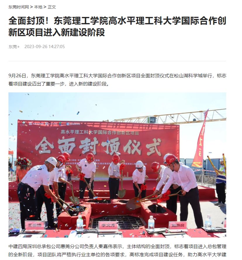 中建四局深圳总承包公司惠莞分公司负责人秦嘉伟表示,主体结构的全面封顶,标志着项目进入总包管理的全新阶段,项目团队将严格执行业主单位的各项要求,高标准完成项目建设任务,助力高水平大学建设,助推新区高质量发展。