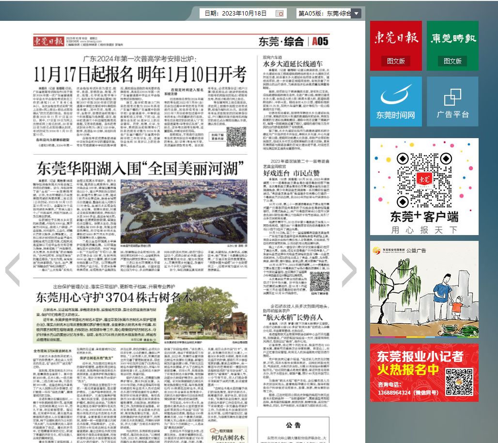近年来,东莞多措并举强化古树名木管护,通过印发《东莞市古树名木保护管理办法》,落实古树名木日常巡查制度和养护责任制度,全面更新古树名木电子档案,积极开展古树寄生植物清理、白蚁防治、树洞修补等工作,用心用情保护好古树名木,守护好绿水青山的美丽记忆与乡愁。目前,全市3704株古树名木焕发新色彩,将城市点缀得如诗如画。