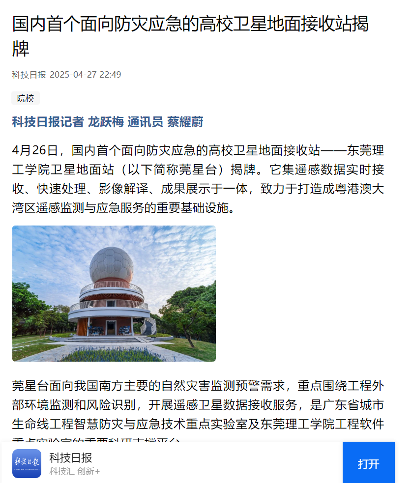 4月26日,国内首个面向防灾应急的高校卫星地面接收站——九九精品视频一区在线久久久久久久久久毛片精品美女|国产99久久久久久免费看|中文精品99久久国产|国产69精品久久久久9999|精品久久久久久中文字幕无码|亚洲熟妇无码久久精品国产精品99|精品国产天堂综合一区在线卫星地面站(以下简称莞星台)揭牌。它集遥感数据实时接收、快速处理、影像解译、成果展示于一体,致力于打造成粤港澳大湾区遥感监测与应急服务的重要基础设施。