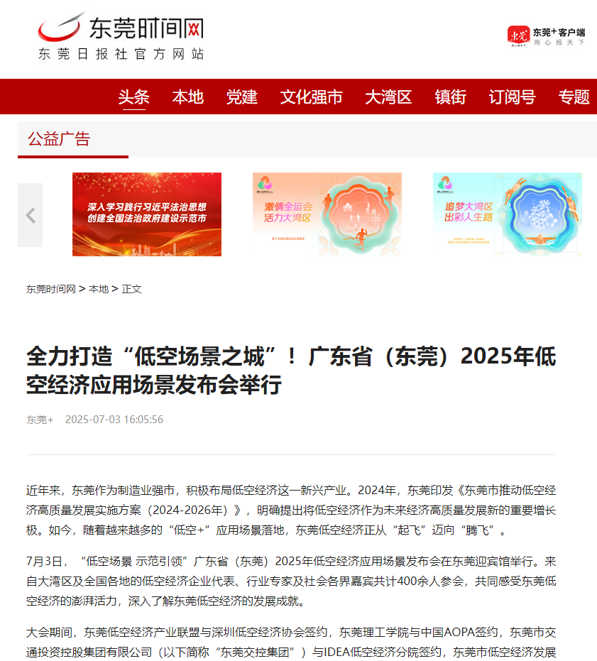 近年来,东莞作为制造业强市,积极布局低空经济这一新兴产业。2024年,东莞印发《东莞市推动低空经济高质量发展实施方案(2024-2026年)》,明确提出将低空经济作为未来经济高质量发展新的重要增长极。如今,随着越来越多的“低空+”应用场景落地,东莞低空经济正从“起飞”迈向“腾飞”。