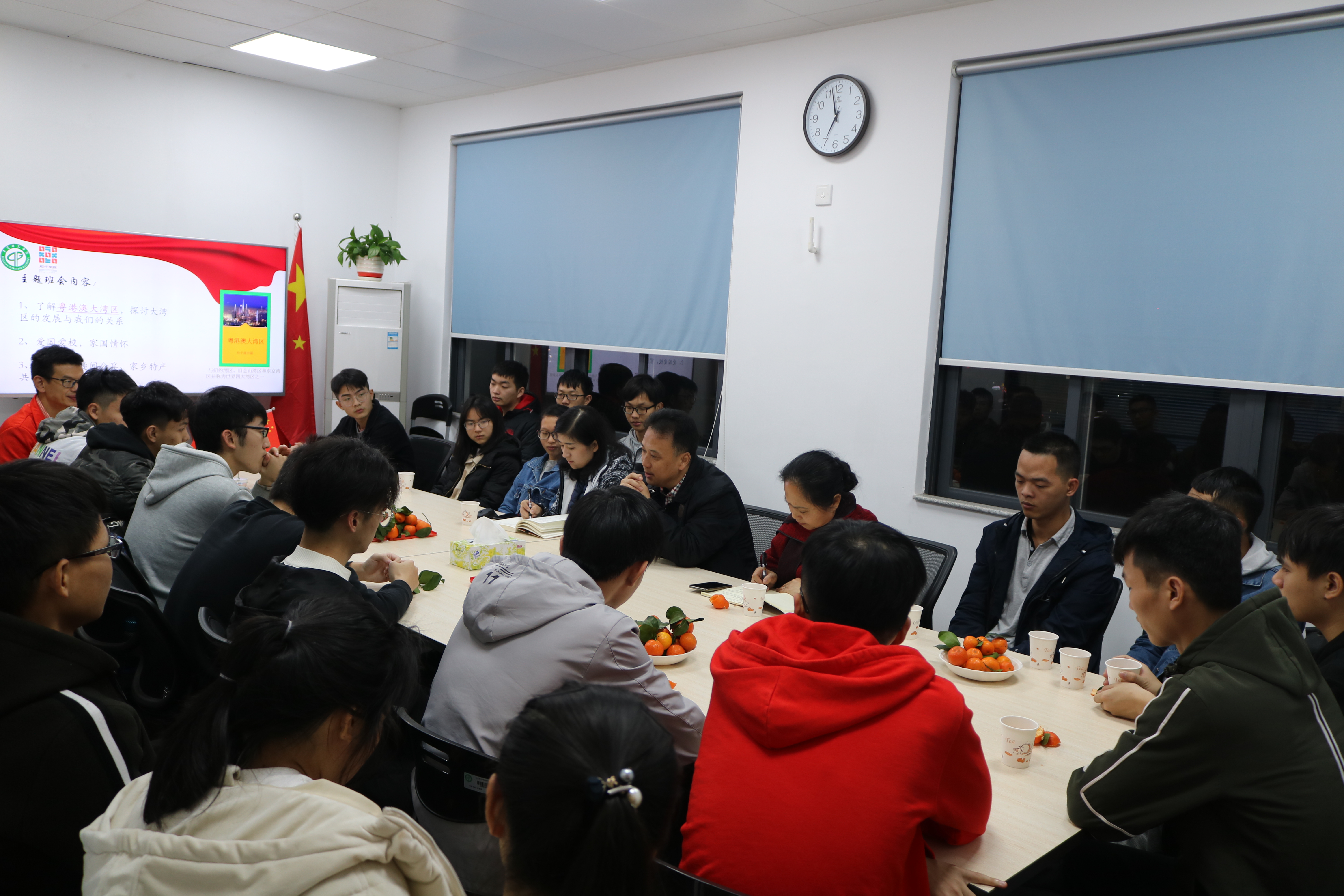 班会以“了解粤港澳大湾区发展规划、探讨发展关系”、“谈谈爱国爱校”、“家国情怀以及分享新春佳节趣闻”、“共尝家乡特产”等内容展开。