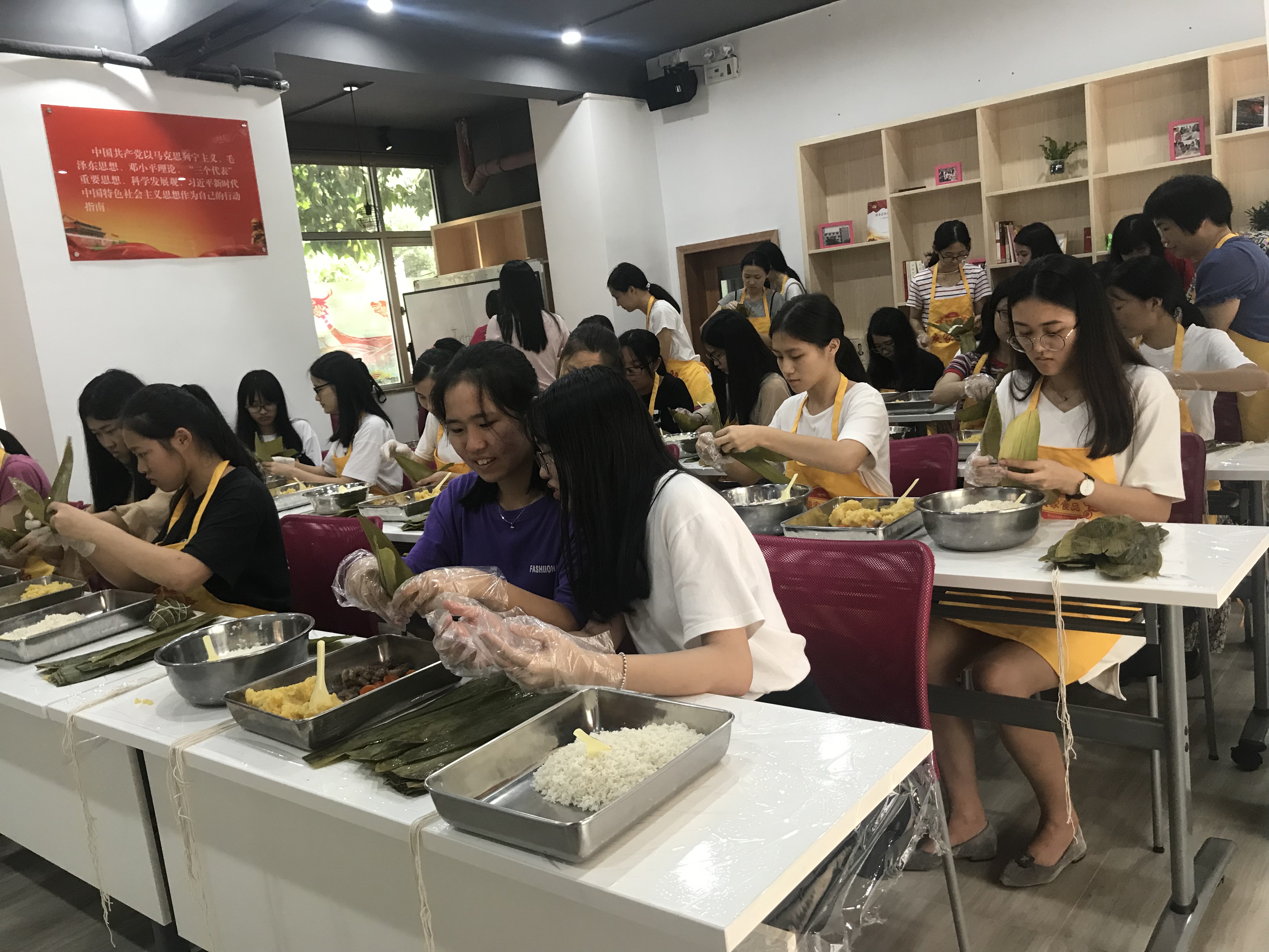 活动得到了同学们的积极响应,活动计划当天下午4点开始,可是时间还没到就有同学直奔“教室”。活动开始,学员数已然超出了统计的报名人数,有些男同学也饶有兴致的投入了此次活动,以致活动中间,临时准备糯米、粽叶等原材料补给。老师现场示范讲解了要领后,大家动手实践,发现看似简单的一弯一绕,技术难点还是挺多的。老师手把手地耐心教同学们包粽子,现场气氛十分热烈。大家兴高采烈地拿着自己包的粽子拍照留念,包进粽子里的何止是糯米和红豆,还有大家高涨的热情和欢乐。