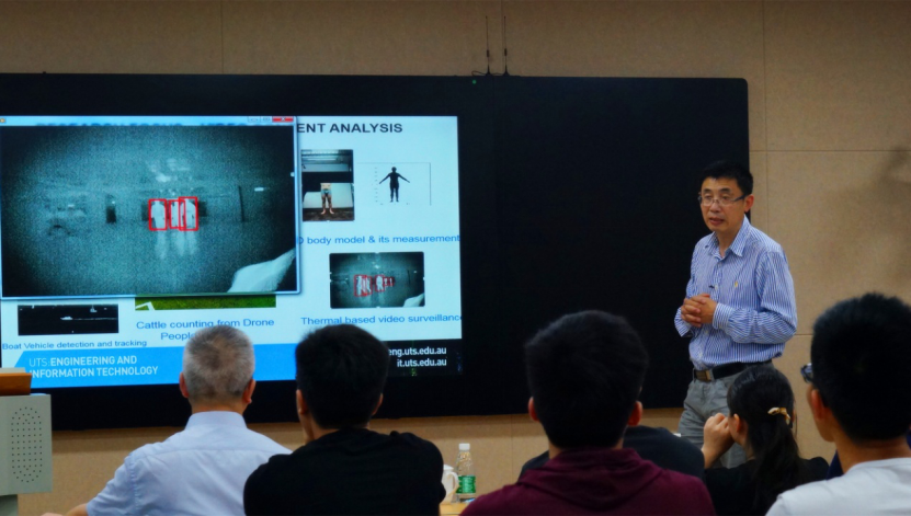 讲座伊始,张健副教授为在场的师生们简单介绍了悉尼科技大学概况及本次讲座的主要内容。在讲座中,张教授先阐述了人工标注的图像数据集已被证明是高层次图像语义理解的关键,但其过程既费时又费力,进而引出了本次讲座的主要内容:一种新的自动化图像数据集构建框架。张健副教授详细介绍了相关的实验事例和应用成效,并与在场师生积极互动,认真回答师生们的疑惑,学术交流氛围浓厚。
