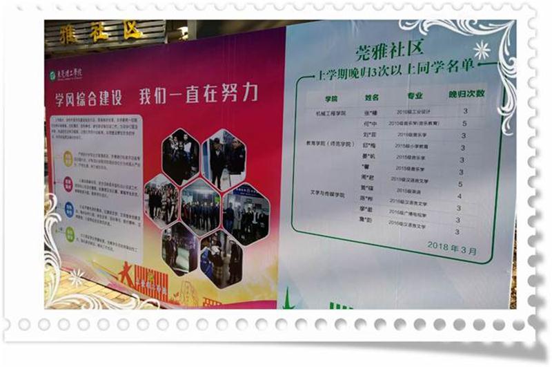 开学后,学工部、知行学院联合其他二级学院严格执行学生社区管理规定,开展晚归和夜不归宿专项治理行动,对专项行动期间发现的违纪行为依规从严处分,严明纪律,树立良好风尚