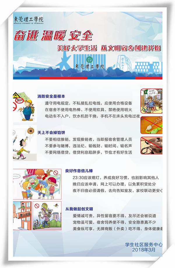 社区服务中心以创建文明宿舍为抓手,开展了形式多样的学生安全教育主题活动,并向两校区所有宿舍派发了安全教育宣传单张。