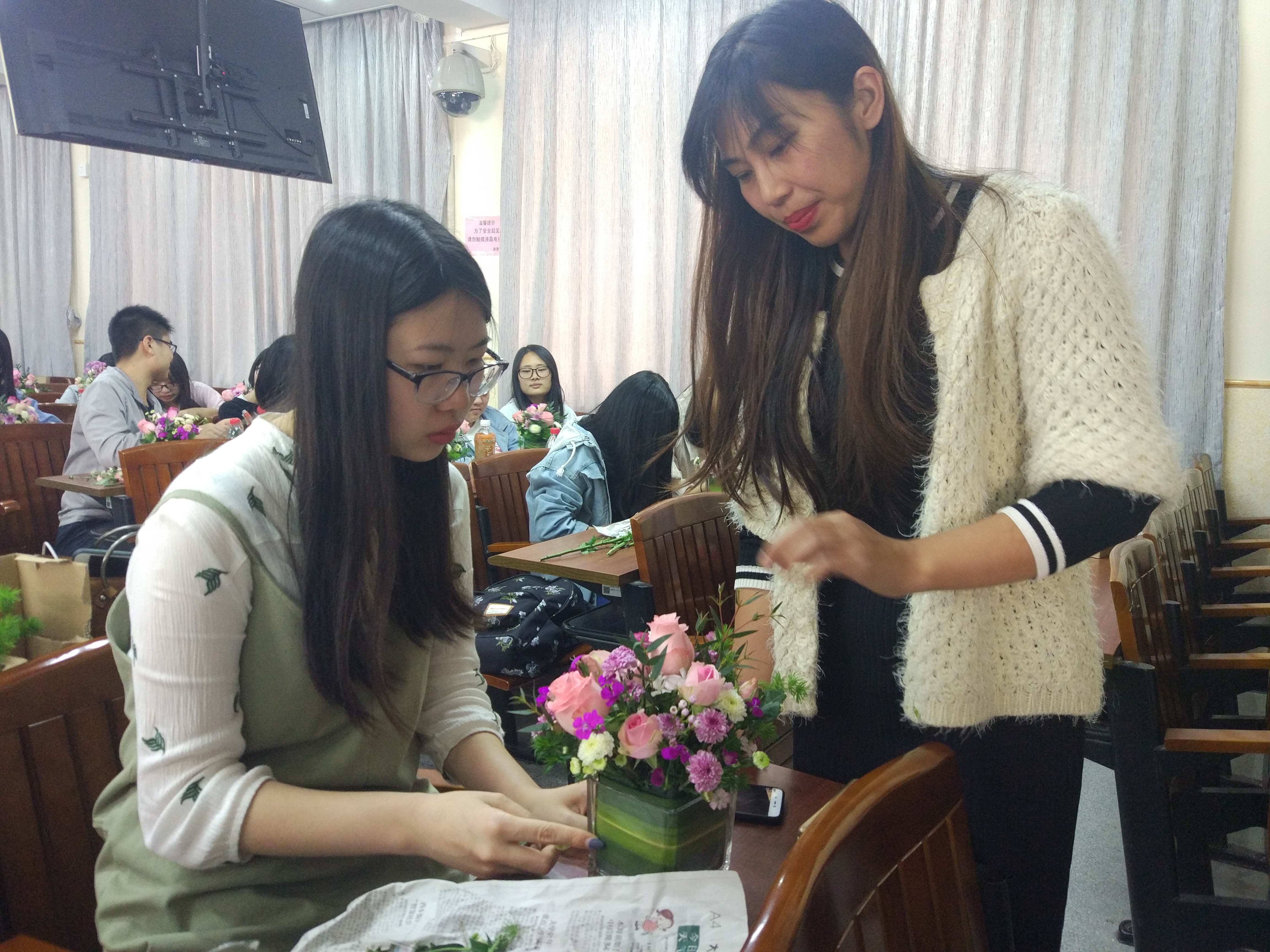 活动前期采用在微信平台上报名与活动现场报名招募的方式,吸引了很多同学积极参与。活动当天花艺师上台讲解插花的详细步骤和插花要遵守的原则,不同的花要有渐进的感觉,而本次课程主题是“自然和开放”。口头讲解后,开始进入一对一教学实操环节。两位老师下台指导同学们插花的细节并告诉大家“花跟人一样,每朵花都有不同的特性,放在不同的位置,有不同的风格”。最后五位同学获得奖励。