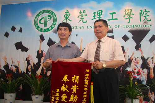 王江水在奖(助)学金设立仪式发表了热情洋溢的讲话,并向热心教育事业的高铁检测仪器(东莞)有限公司赠送“捐资助学,奉献爱心”的锦旗。