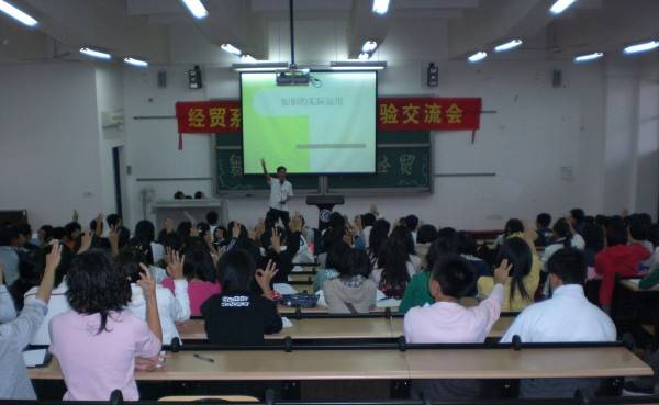 04国贸(1)班黄浩德、杨朝龙、赖月好,04国贸(2)班冼冠余、05国贸(1)祈巧玲、06国商(1)黄晓婷等优秀学生在会上分别给新生们介绍了自己的学习经验,并耐心解答了新生们提出的问题。最后,由系团总支第一副书记邓武均同学作了大会总结,并在黄煜焙先生指导下,通过手语表达心中理想。学习经验交流会在热烈的气氛中圆满结束。
