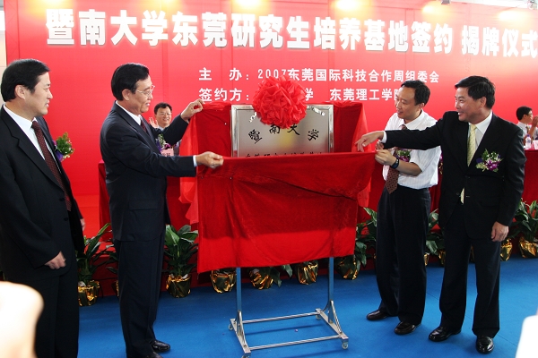 随后,冷晓明、雷朝兹、胡军、周致纳一同为“暨南大学东莞研究生培养基地”揭幕。